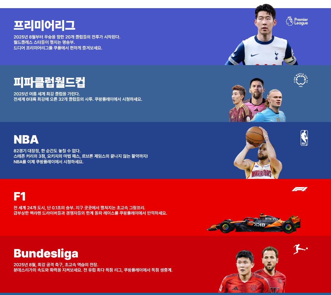 2025년 6월 15일, 쿠팡플레이는 기존 OTT 체험의 한계를 보완하는 유료 스포츠 전용 옵션 ‘스포츠패스’를 도입했습니다. 와우 멤버십(기본 월 7,890원) 가입자에게 월 9,900원이라는 합리적인 추가 비용으로 제공되며, 총 월 17,790원만 투자하면 프리미엄 스포츠 방송을 자유롭게 즐길 수 있습니다. 스포츠패스는 프리미어리그(EPL), 포뮬러원(F1), 미국 프로농구(NBA), 미식축구(NFL) 등 해외 주요 스포츠를 포함하며, 국내 인기 종목인 K리그와 대표팀 경기는 별도 비용 없이 기본 와우 멤버십만으로도 시청할 수 있습니다. 또한, 일부 콘텐츠는 4K 화질, 멀티캠시청, 타임머신 기능 등 고급 스트리밍 옵션까지 포함됩니다.
